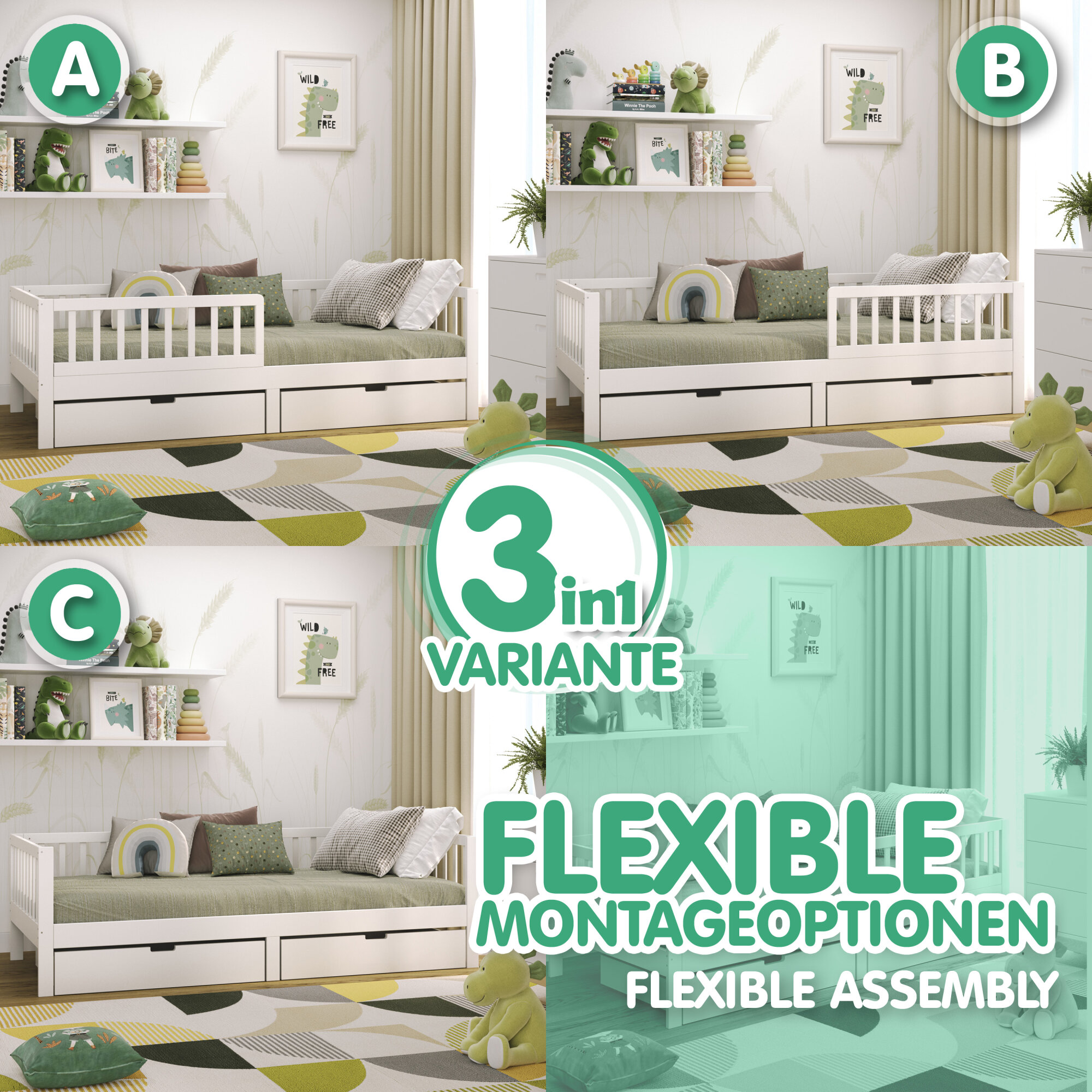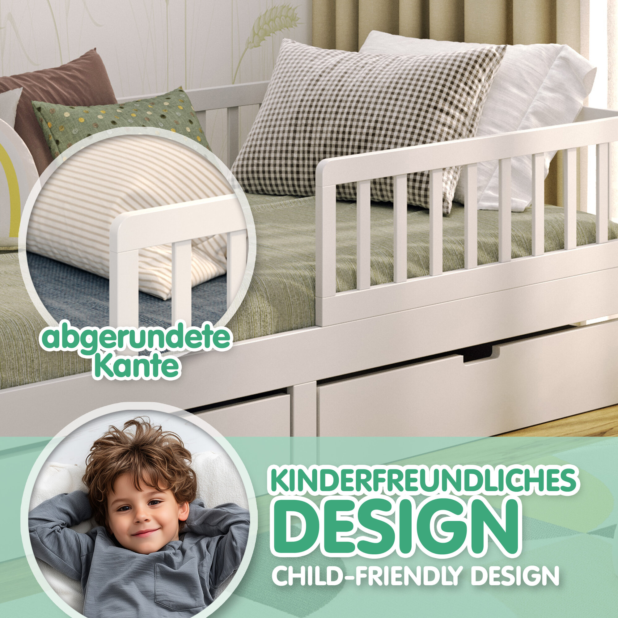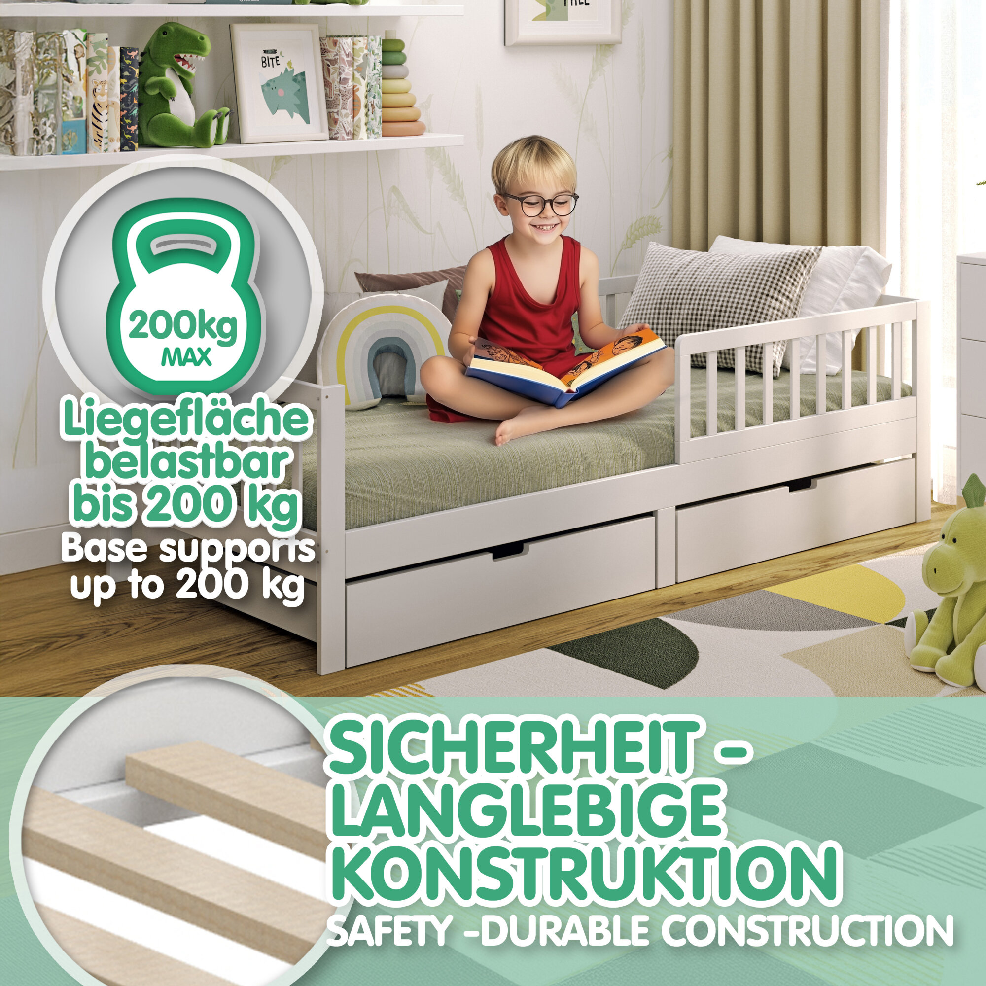 • Lieferumfang: Bettgestell, Lattenrost, Rausfallschutz